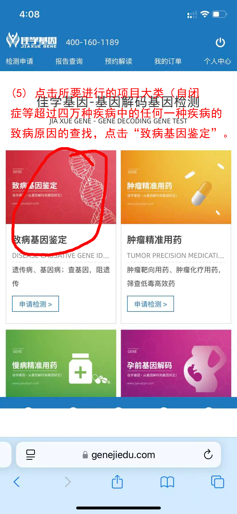 (5)点击选择基因检测项目大数,顺利获得基因检测查找自闭症等超过一万种疾病中的任何一种疾病的致病基因,点按"致病基因鉴定"项目。