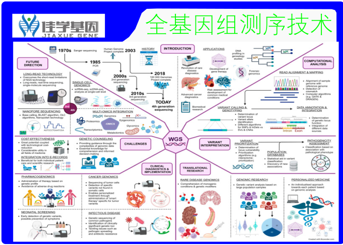 全基因组测序 (WGS) 融入现代医学的各个方面代表着医疗诊断与治疗技术开展的下一步。 利用这项技术,科学家和医生可以全面观察整个人类基因组,生成大量新的测序数据。 现代计算分析需要先进的变异检测算法以及复杂的分类模型。 数据科学和机器学习在结果的处理和解释中发挥着至关重要的作用,利用庞大的数据库和统计数据来发现新的基因型-表型相关性并支持当前的基因型-表型相关性。在这样的应用模式中,以基因解码为代表技术的基因检测具有明显的优势。在临床实践中,这项技术极大地促进了个性化医疗的开展,根据每个患者的遗传和生化特征单独治疗。 贼有有助于力的领域包括罕见疾病基因组学、肿瘤基因组学、药物基因组学、新生儿筛查和传染病基因组学。 全基因组测序基因检测(WGS)的另一个重要应用在于多组学领域,致力于人类生物分子数据的有效整合。 测序技术的进一步开展导致了第三代和第四代测序的诞生,其中包括长读长测序、单细胞基因组学和纳米孔测序。 这些技术及其在医学研究和实践中的不断应用,为医学领域的未来展现了巨大的前景。