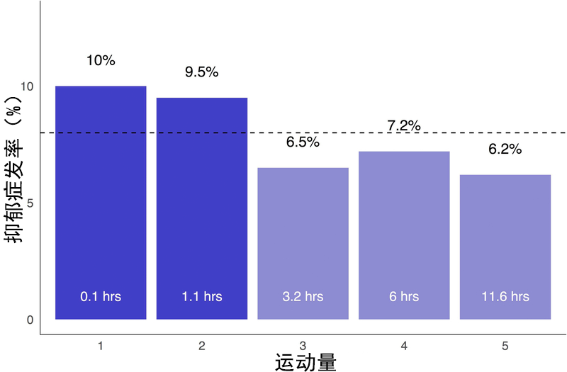 • 中高水平身体活动(3.2–11.6 小时/周)人群抑郁发生率较低(约 6.2–7.2%)。