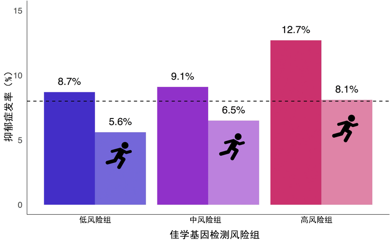 • 运动对不同基因检测风险组抑郁症发生率的影响。带有跑步图标的条形表示体力活动较高的组(Q3-Q5;每周至少约3.2小时)。无图标的条形表示体力活动较低的组(Q1-Q2;每周0至约1.1小时)。虚线表示样本中抑郁症的患病率(8.1%)。