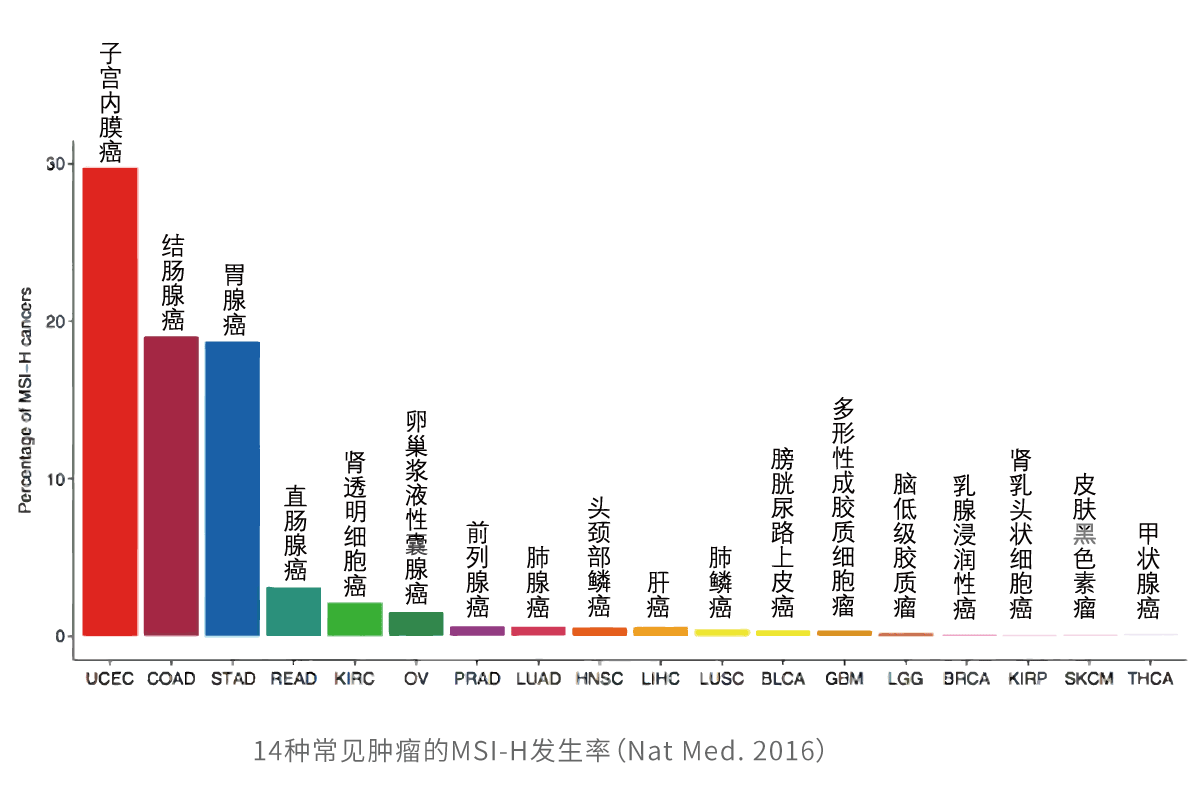 微卫星(microsatellites)是遍布于人类基因组中的短串联重复序列。与正常组织相比,肿瘤组织的微卫星由于重复单位的插入或缺失而导致微卫星长度的改变,就叫做微卫星不稳定性(Microsatellite Instability,MSI)。大量研究表明,MSI是由错配修复(MMR)基因发生缺陷引起的,与肿瘤的发生密切相关。